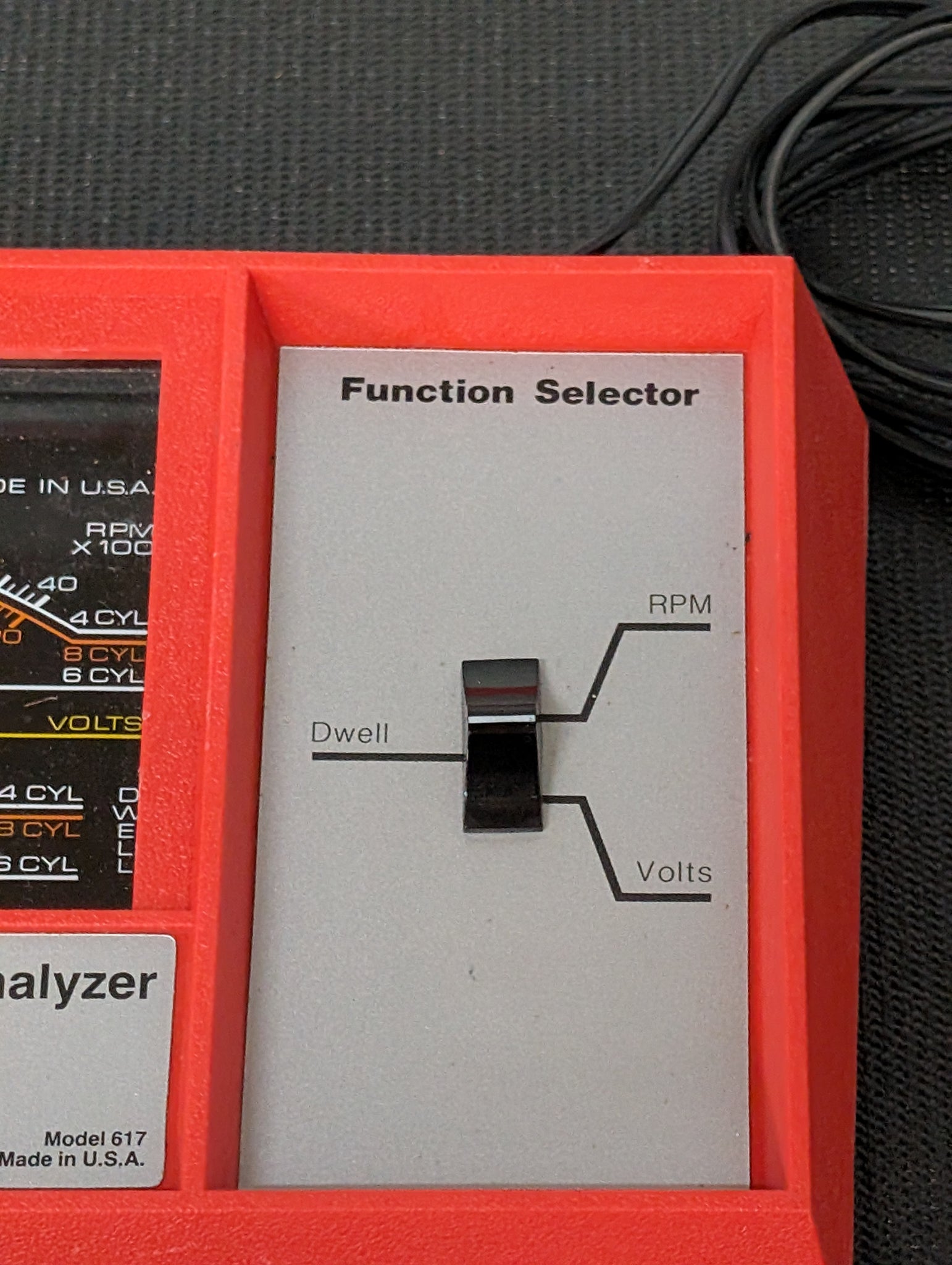 This analyzer little unused and is in excellent condition and the meter is spiffy-clean. The aluminum faceplates look like new. I have owned this ~35 years and just once used it. I just tested it and it works great. This analyzer tests 12 volt conventional & electronic ignition systems using vehicles battery 4,6 or 8 cylinders domestic or imported. It is housed in a red polycarbonate housing with a 6" meter. No batteries are required, it is powered from the car's 12v system.