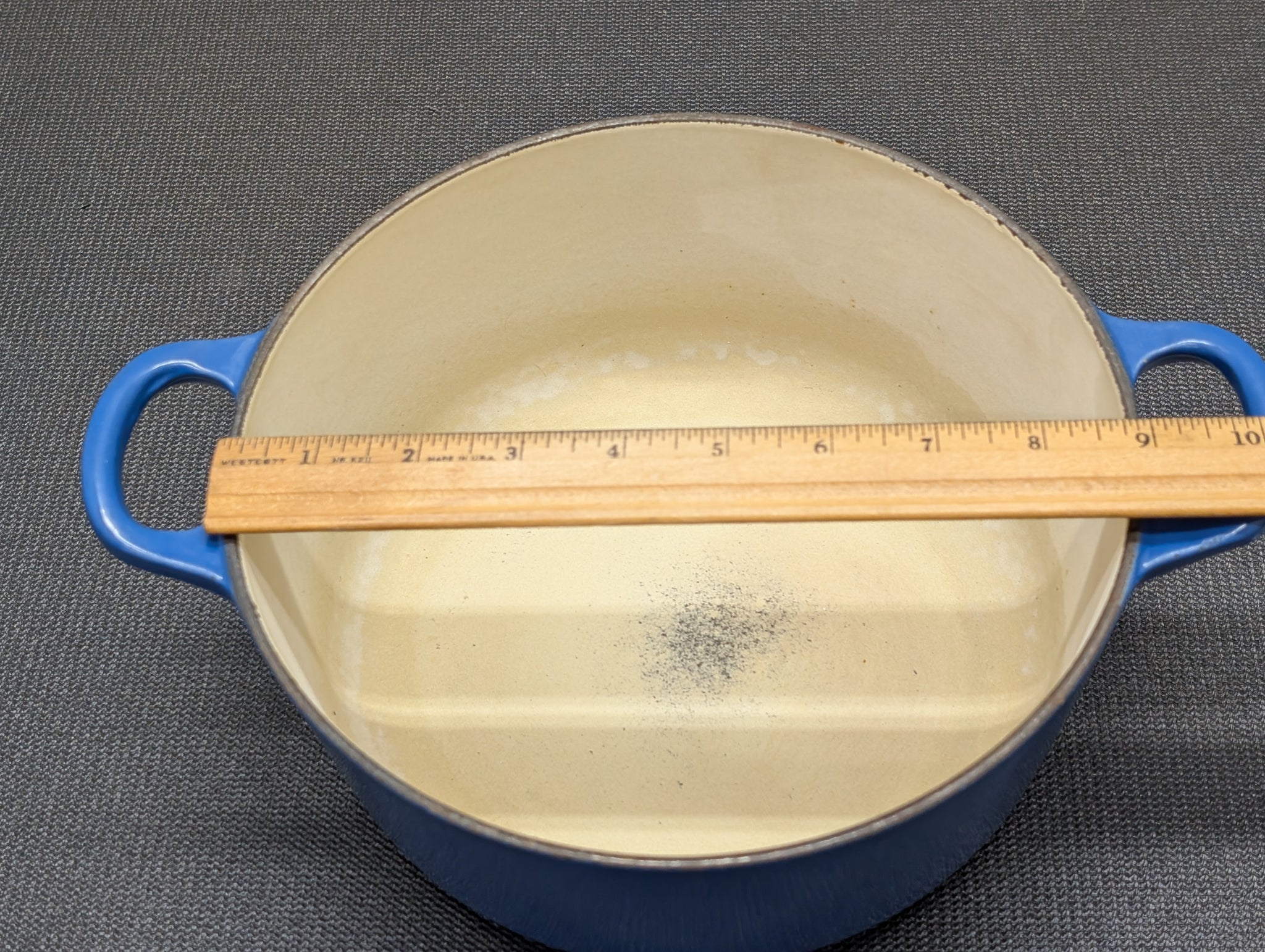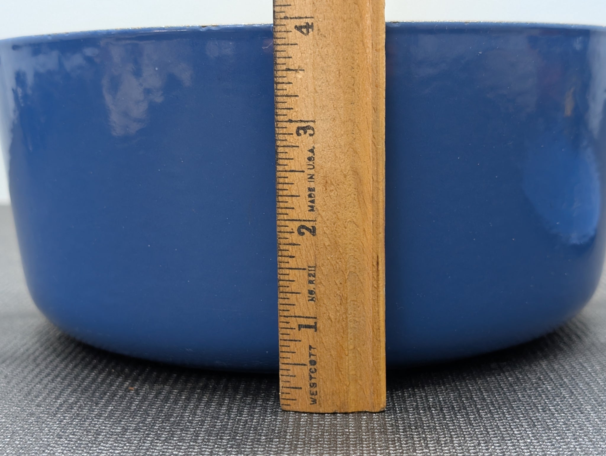 Excellent Used Condition, this was my Mother's, sits nice and flat. Lid fits nice and tight, the inside has some very minor staining as indicated in images, no signs of burnt on food debris, inside or out. Measures about 13 x 9" in size Marseille