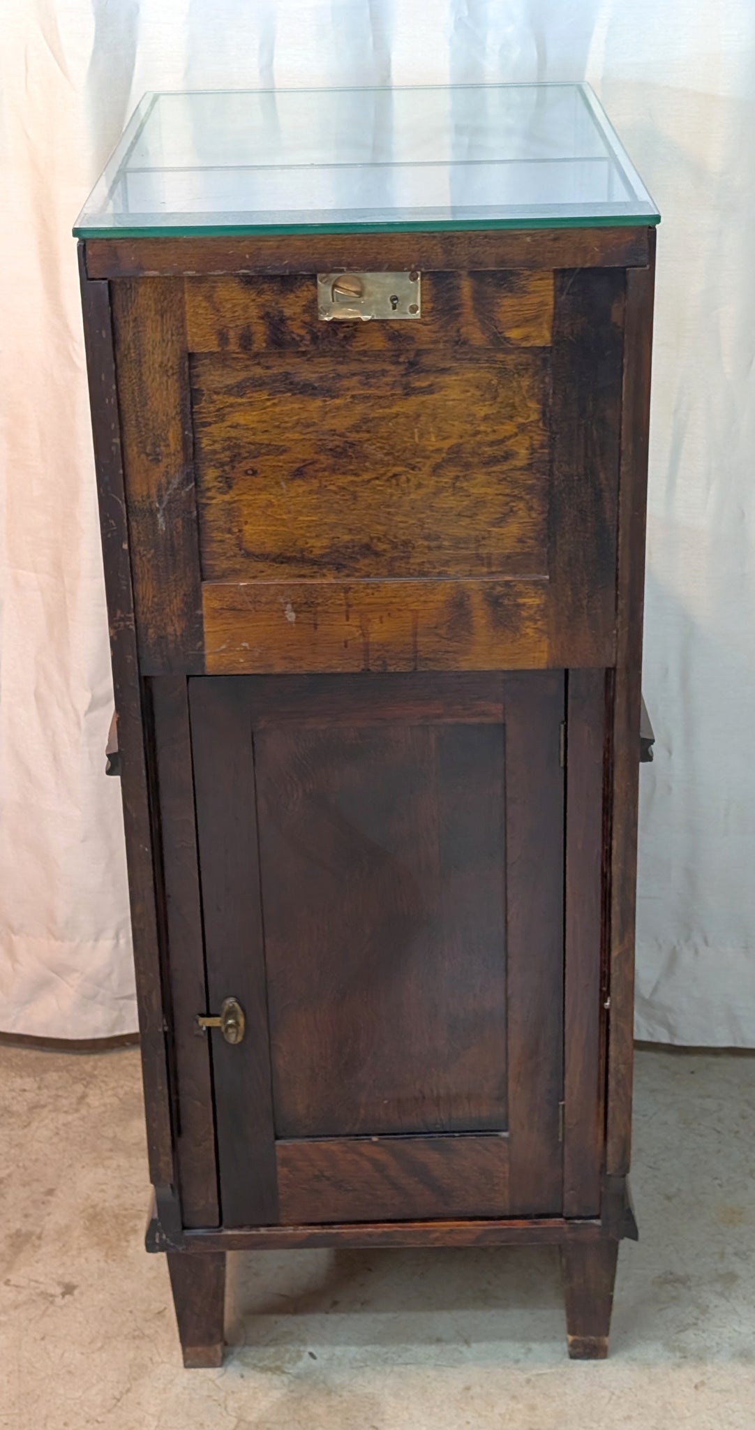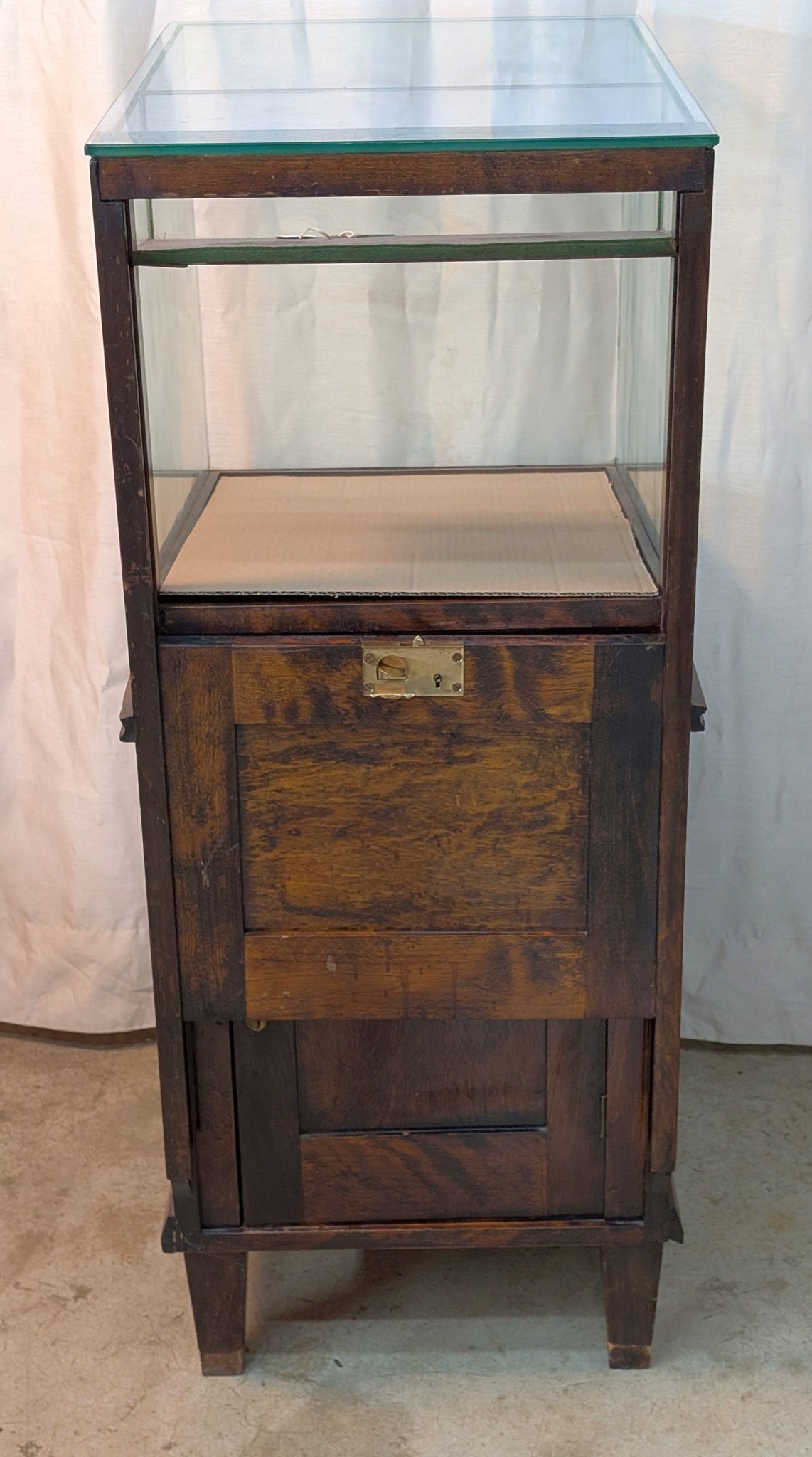 Walnut-stained, solid boxwood display cabinet with a glass vitrine top with beveled, phenolic bonded front and side panels, brass hardware, and a paneled storage compartment below. The upper display section has 3 sides and top of unobstructed glass panels The vitrine top is accessed from the rear via a guillotine access door with a solid brass latch and and original key! The interior can be easily lined if you wish. The lower cabinet offers enclosed storage, set on 4 tapered legs. The lower storage cabinet shows plenty of evidence of leaky fountain pens.