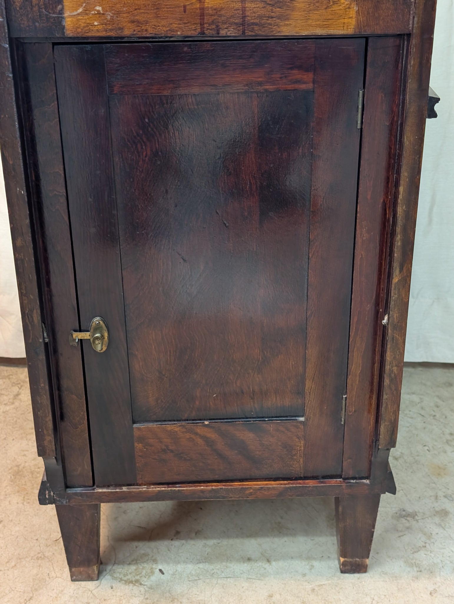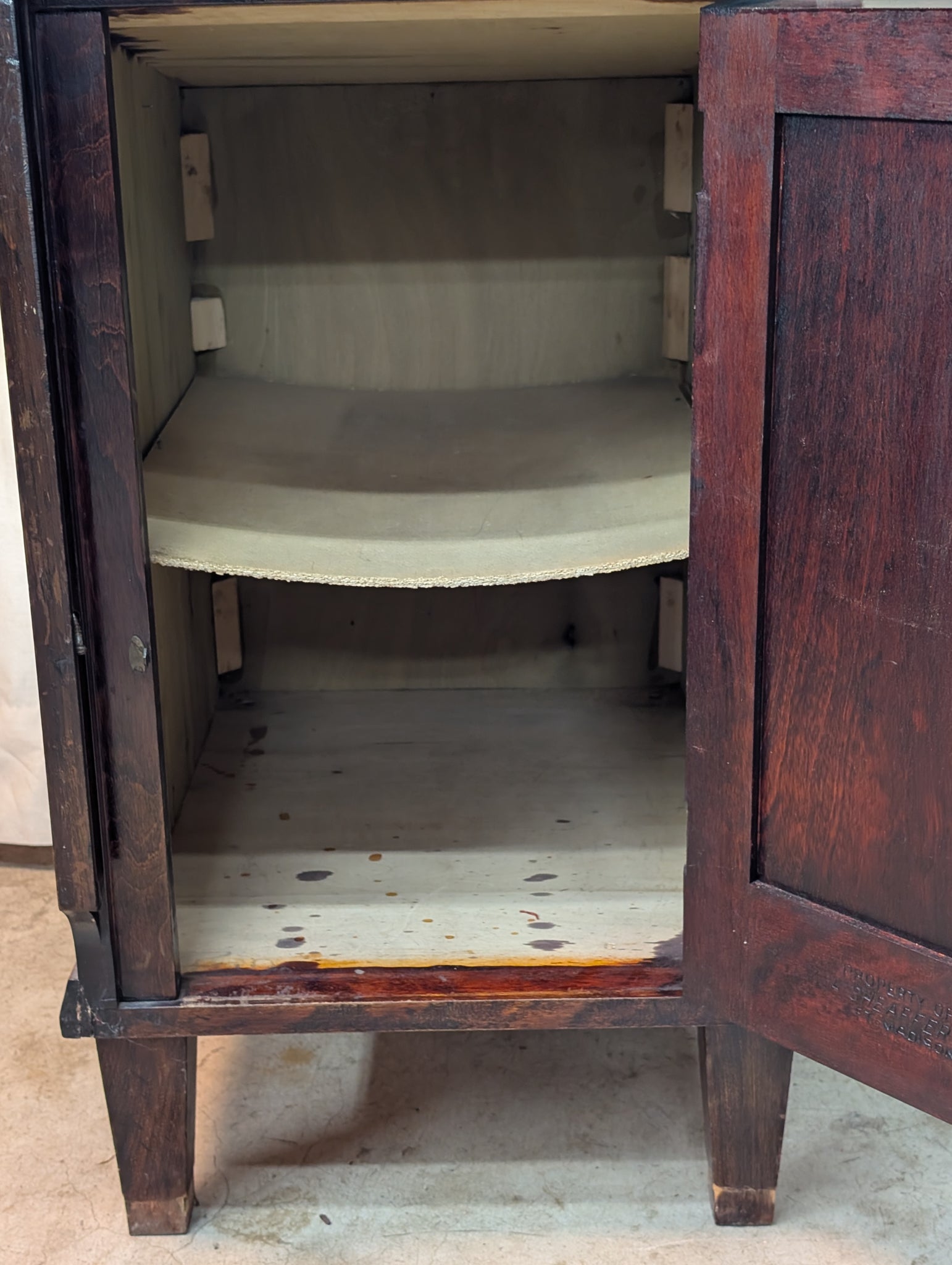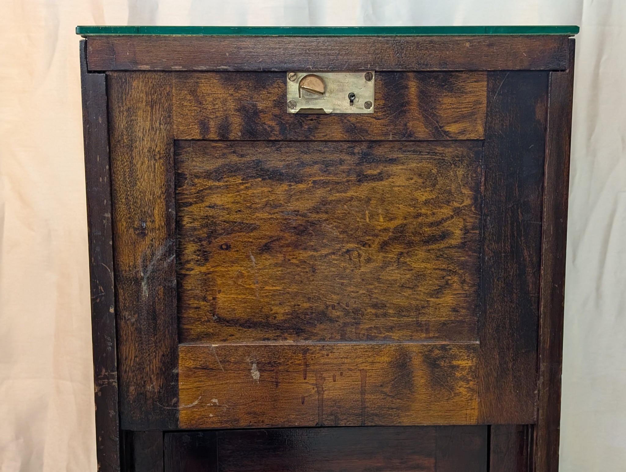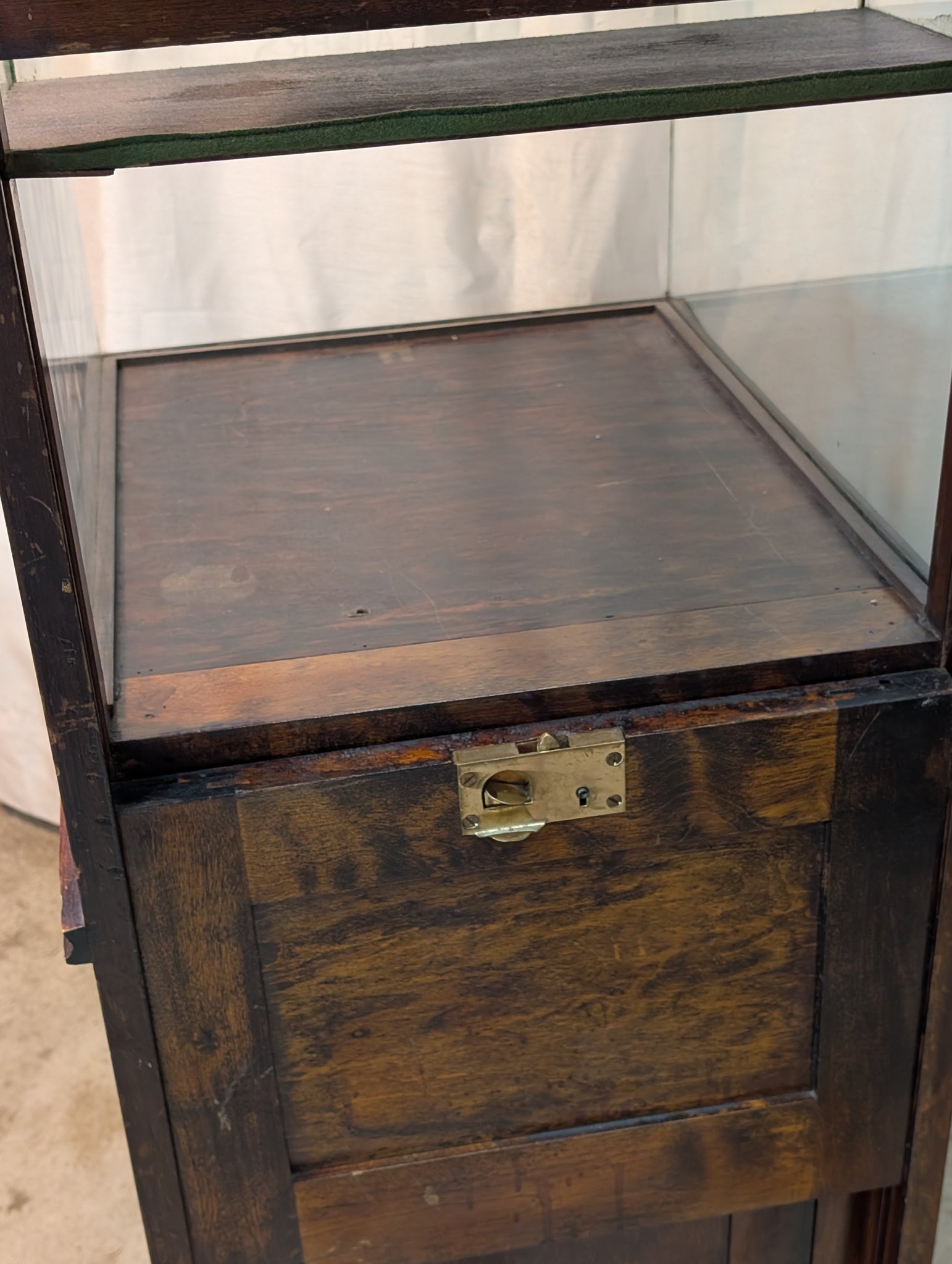 This shows 60 years of retail wear with the usual surface scratches to the wood, and just a handful of scattered scratches to the glass. The overall wear is consistent with age and use, this cabinet structurally sound and the hardware is original and functional.