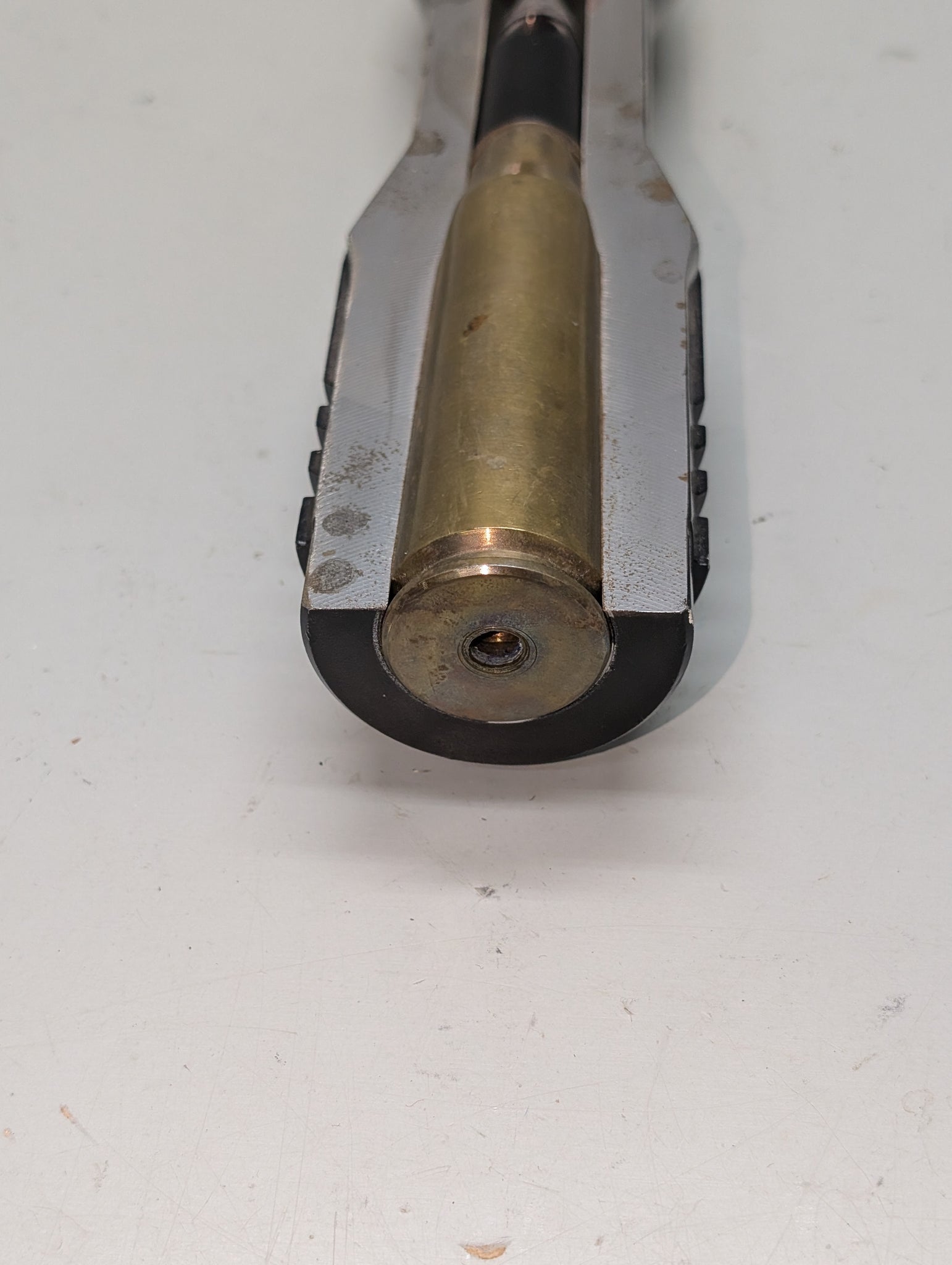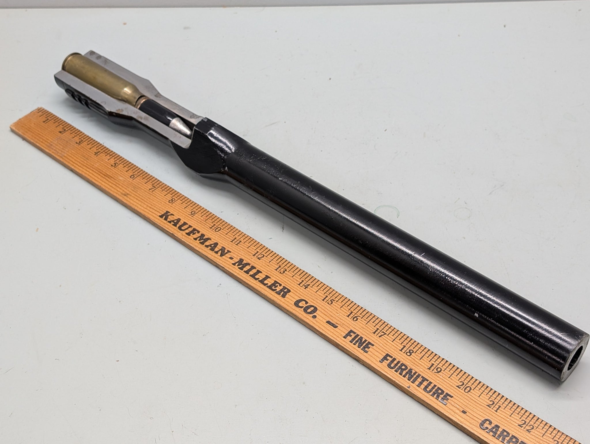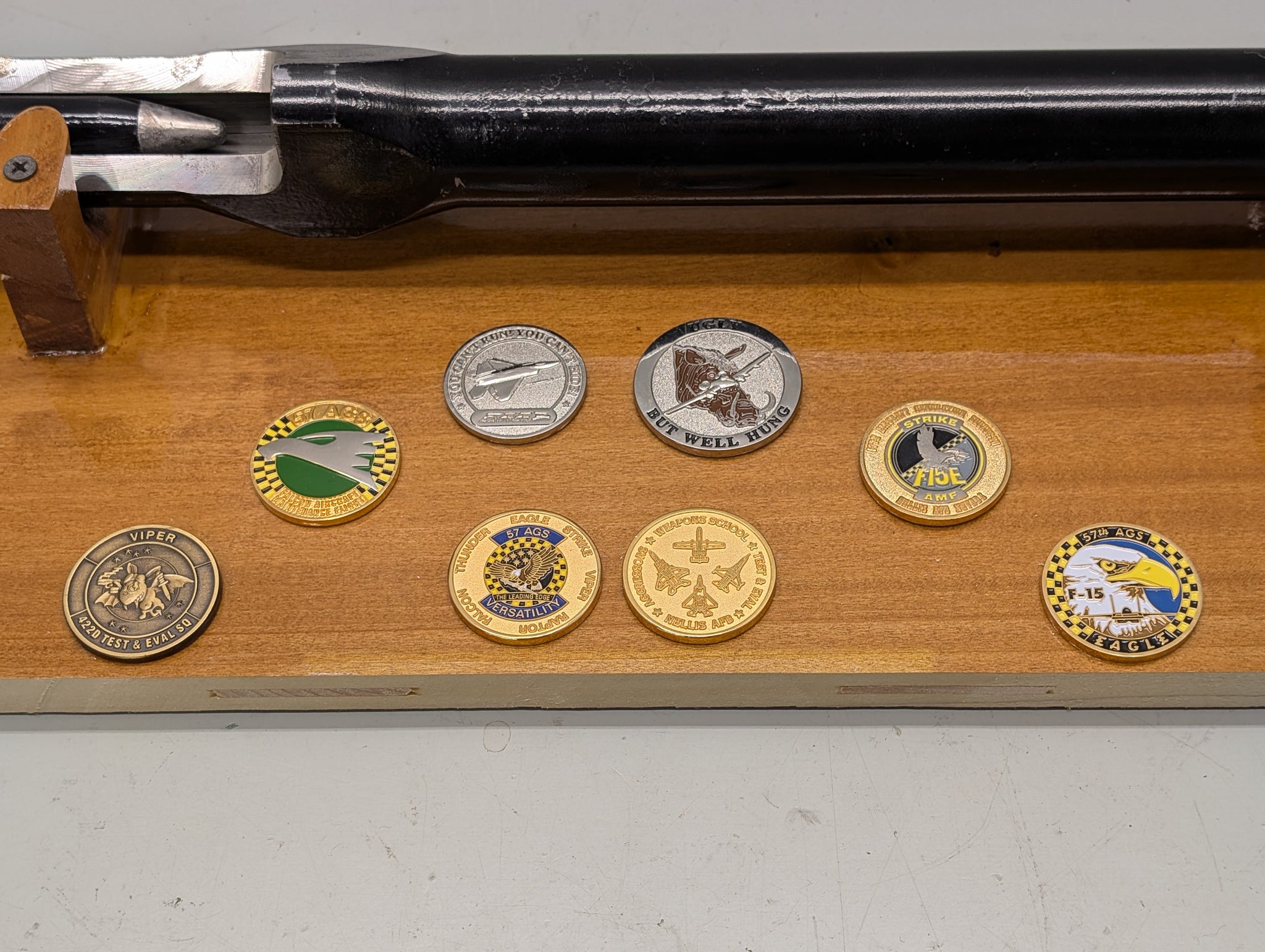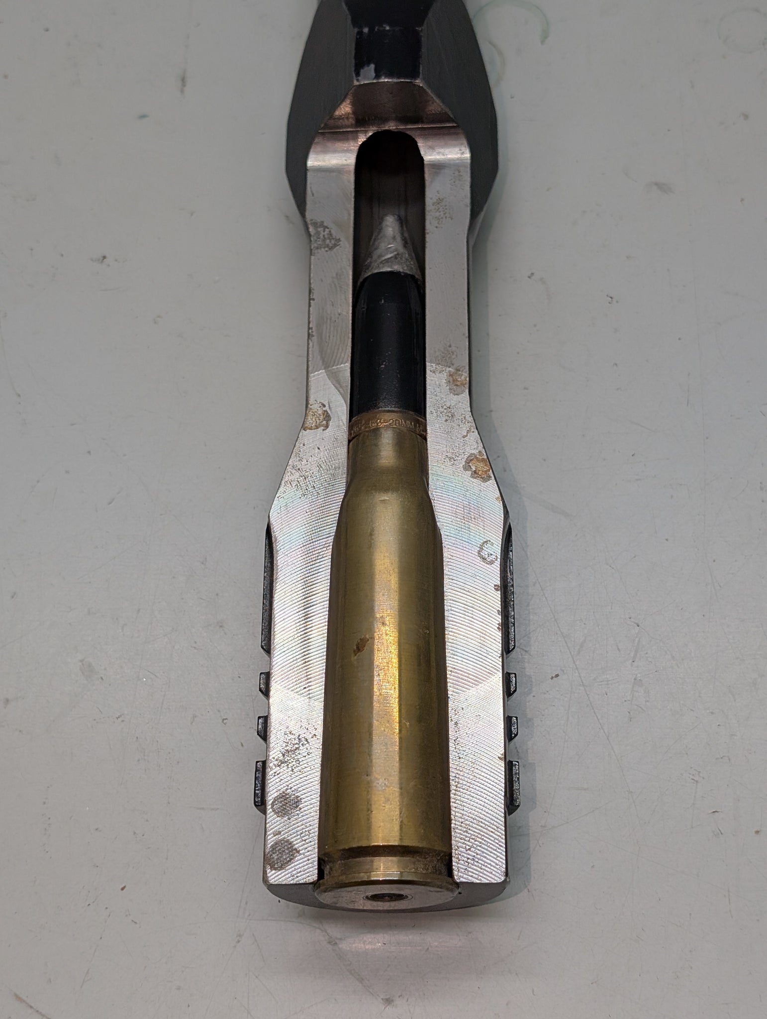 This is a genuine cutaway breech section of an M61 Vulcan, which is a six-barrel, air-cooled, electrically fired Gatling-style rotary cannon which fires 20 mm × 102 mm (0.787 in × 4.016 in) PGU-28/B rounds at ~ 6,000 rounds per minute. The M61 and its derivatives have been the principal cannon armament of United States military fixed-wing aircraft for over sixty years. The M61 was first deployed in the Republic F-105D Thunderchief in 1966. This barrel section is 22" long, this is nicely mounted on a wall plaque display, and weights ~17 pounds.
