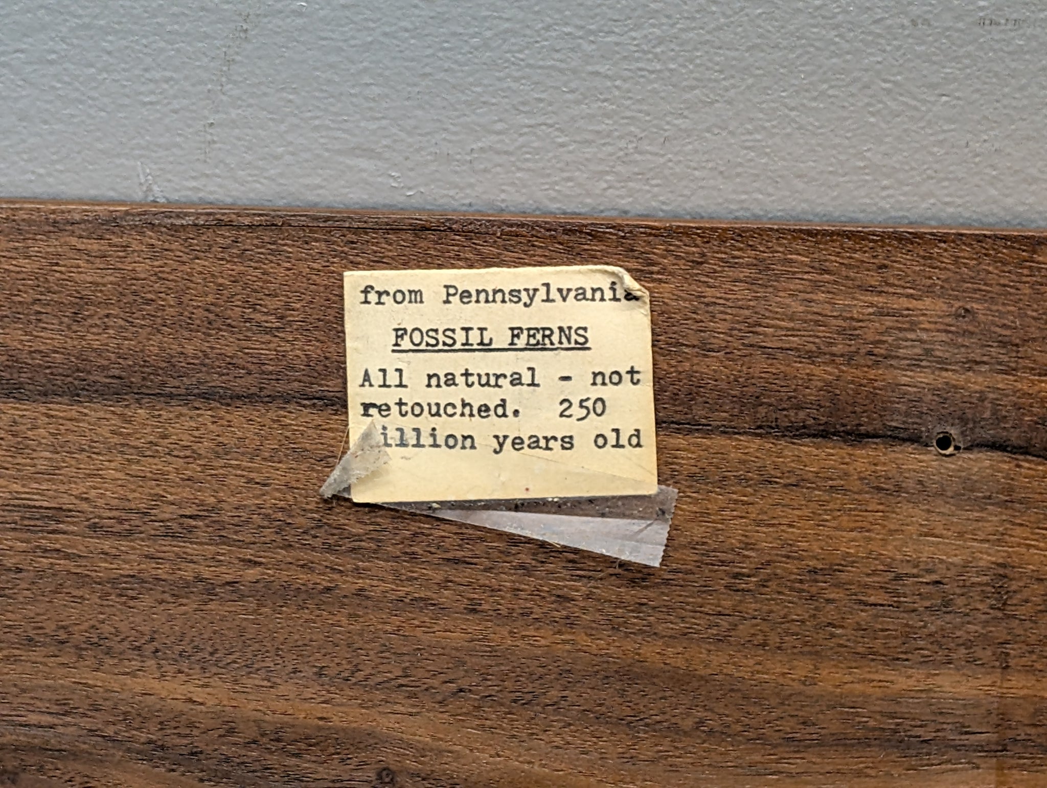 My Dad brought this back from a trip to the St. Clair Mine store in Schuylkill County, PA, in 1957.  The mine was notable for the abundance of plant fossils found in the Llewellyn Formation (300 mya, Pennsylvanian Period) and are one of the few places where one can find these very detailed white, sometimes yellow and orange ferns on a striking contrast of black shale. This specimin is notable in presenting all 3 colors. The plants died and fell into the swamp, where in a low temperature, pressure, and oxygen environment the plant tissue were slowly replaced by pyrite (from sulphides). Pyrophyllite (aluminum silicate, a whitish mineral) is believed to have replaced the pyrite at a later stage as the sediments piled up and the temperature and pressure became greater. The ferns most commonly found are Alethopteris, Neuropteris, Pecopteris, and Sphenophyllum. The mine and site is no longer open for excavation and those available are truly priceless.